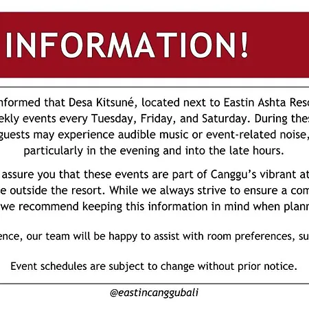 Le centre de Canggu est accessible en 15 minutes à pied et les attractions naturelles telles que la Plage Petitenget sont à 4 km. Le Parc de divertissement Finns Recreation Club se trouve à 25 minutes à pied d'Eastin Ashta Resort de Canggu, tandis que l'aéroport international de Denpasar est à 20 km.