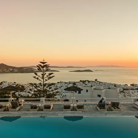 Situated around a 5-minute walk from Aegean Sea, Hotel Alkyon Mykonos Town offers bicycles for rent. Offering views of the mountain, this 4-star hotel is just a minute's drive from Matogianni and boasts an outdoor pool.